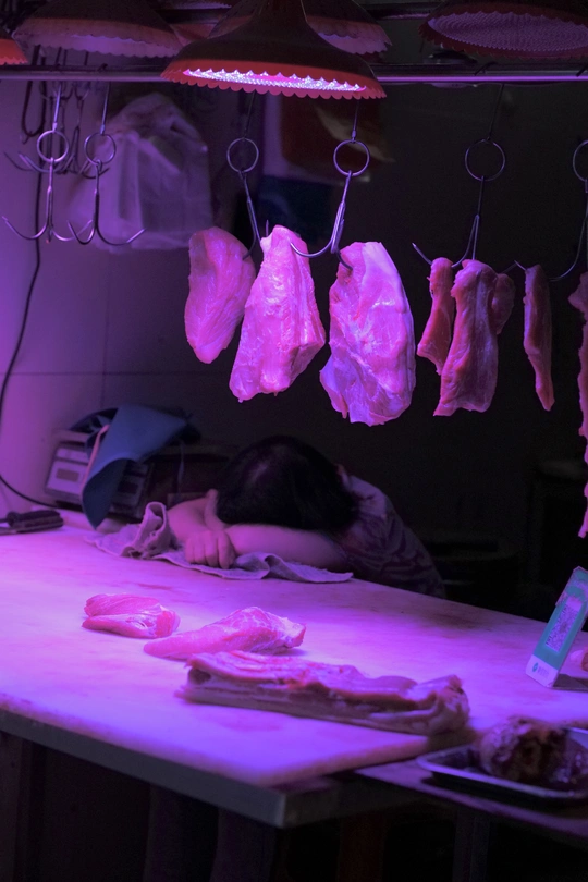 过了正午,肚子已经在强烈发声,我循着手机的导航找进食的店铺,穿过一个安静的市场,意外地碰上市场里的午休,每一个档口的人都在趴着,灯光变为统一的暗紫色,天色也仿佛趴下了般昏暗下来。
