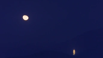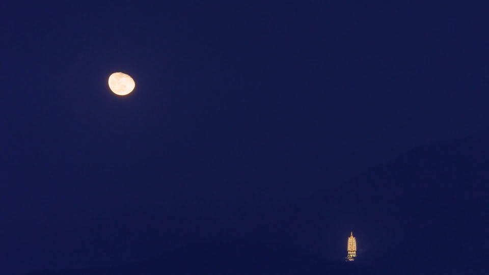 月出时刻,深圳仙湖植物园弘法寺的本焕塔与月亮同辉