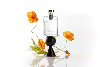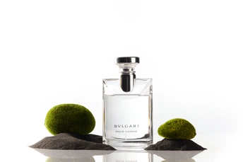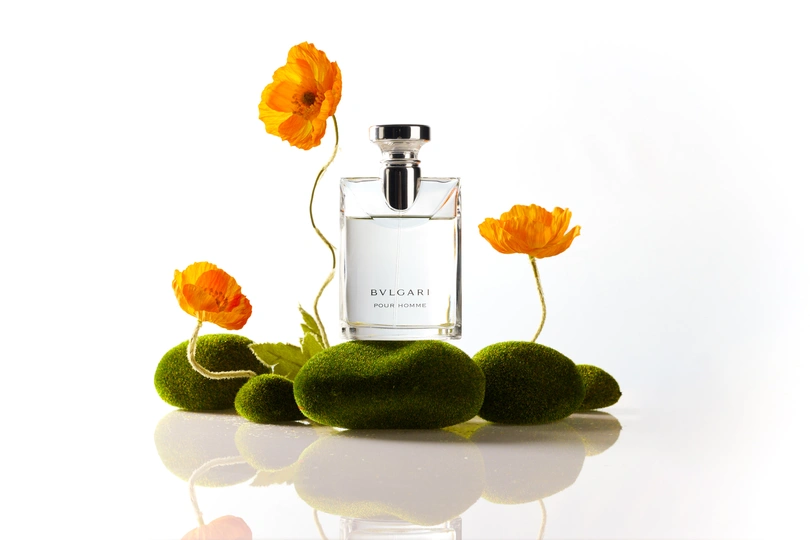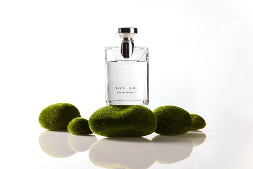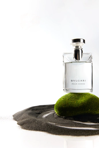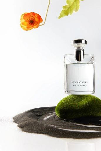这是一组在棚内拍摄的宝格丽大吉岭茶香水。想通过在画面里的长满青苔的石头和花朵,给人一种自然的感觉。同时通过这些静物的组合,呈现给观看的人一种简约、高级以及大气的感受。