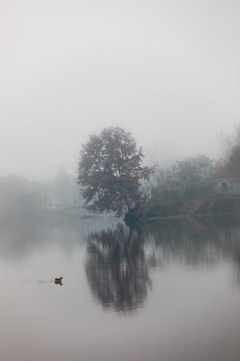 2022年初冬,七里河湿地旁的小村庄,薄雾蒙蒙,一只小野鸭在湖里畅游,像极了儿时的老家。。。