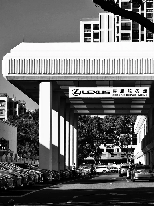 雷克萨斯汽车4S店售后服务部大厅。 冬日下午,散步路过。 日光下,立柱、地面光影明显。