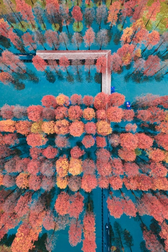 秋天的青西郊野公园,颜色充满了诱惑,大片的红色,一簇一簇,与水面组成极美的放射状线条