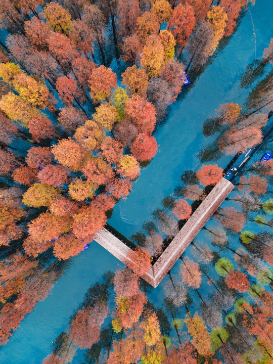 秋天的青西郊野公园,颜色充满了诱惑,大片的红色,一簇一簇,与水面组成极美的放射状线条