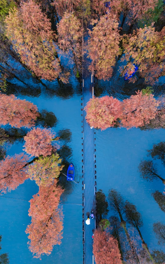 秋天的青西郊野公园,颜色充满了诱惑,大片的红色,一簇一簇,与水面组成极美的放射状线条