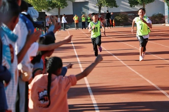 迎面跑来的两个小男孩是听障班的同学,左侧为他们摇旗呐喊的也大都是听障生,虽然没法像健全孩子那样为自己的朋友清晰地大喊“加油”,他们也在努力地热情鼓劲。一部分听障生做过手术后佩戴耳蜗或助听器,听力会有所改善,但又因有言语障碍,还是没法健全人一样清晰的发音。 我被现场听障孩子们的氛围感动到了,相机抓拍到的这个瞬间,我听到了左前方拉拉队发音不标准的“加油”,更多声音则是接近“啊…啊…”。奔跑着的7号男孩或许并没有听到朋友们的加油声,但他看到了,后来他一直微笑着跑到了终点。