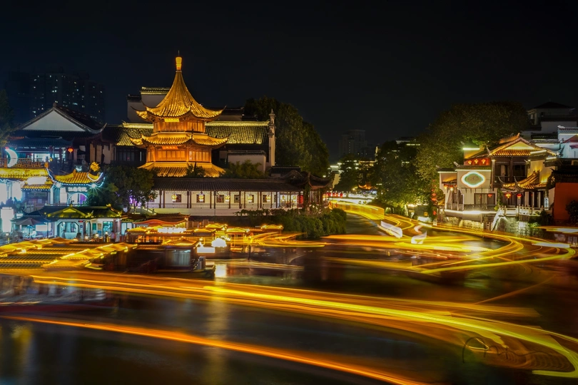 秦淮河跨越古今,时至今日依然繁忙。在南京夫子庙秦淮河景区的夜晚,石桥上游人如织,摩肩接踵,而桥下也不再是潺潺流水,从古代运输要道变成了今天的游船胜地,河道口水域不大却塞满了游船,满载一船船游客夜览秦淮河,在相机慢门的演绎下化为光轨,似要梦回唐朝。