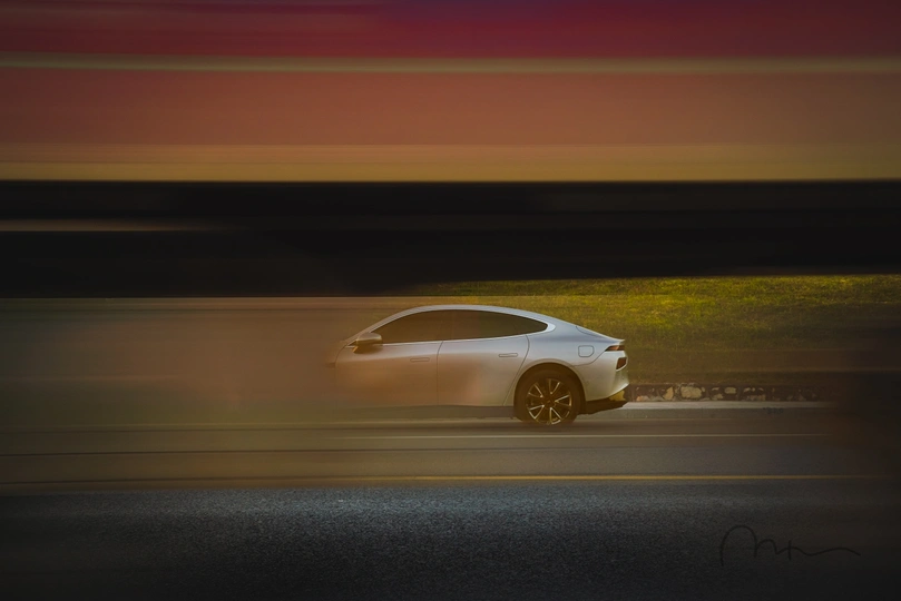 在柏油路上驰骋的是各色车辆,各种造型飞驰而过;不在柏油路上的是静止不动的小鹏P7。我蹲在地上,透过来往的车底死盯住它,仿佛田径大赛上鸣枪起跑前的凝神静气,生怕一不留神,运动员的身影已经跃出视线。同田径运动员类似,车的宿命也许就是奔跑,而眼前这一台,虽然它优雅的坐看风云,但我不敢大意,幻想着它随时弹射起步,加入到路上竞赛。是的,我相信他会跑,而且我不敢眨眼,因为大家都知道,它起步确实挺快。这“预备之美”,爆发前的优雅,令人着迷。