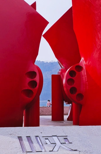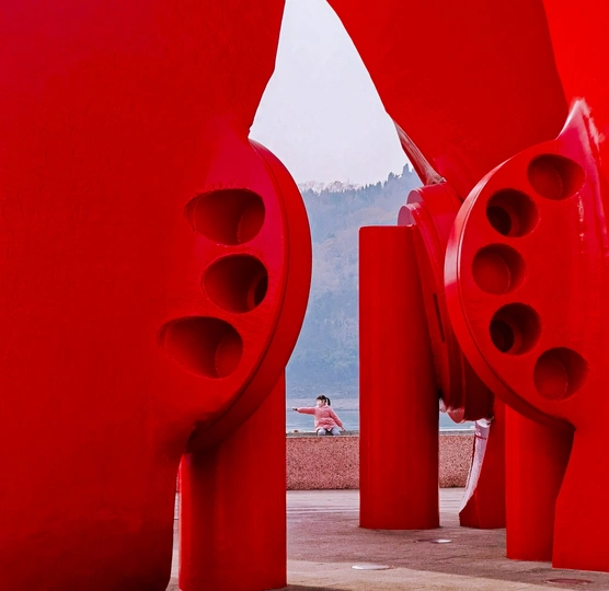 红色雕塑名称是三峡力量,透过峡之隙,小女孩手持玩具剑有女侠范。请各位指点如何构图更好