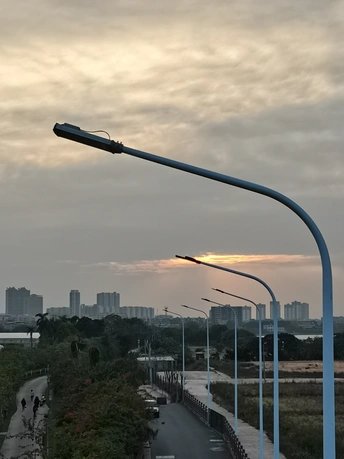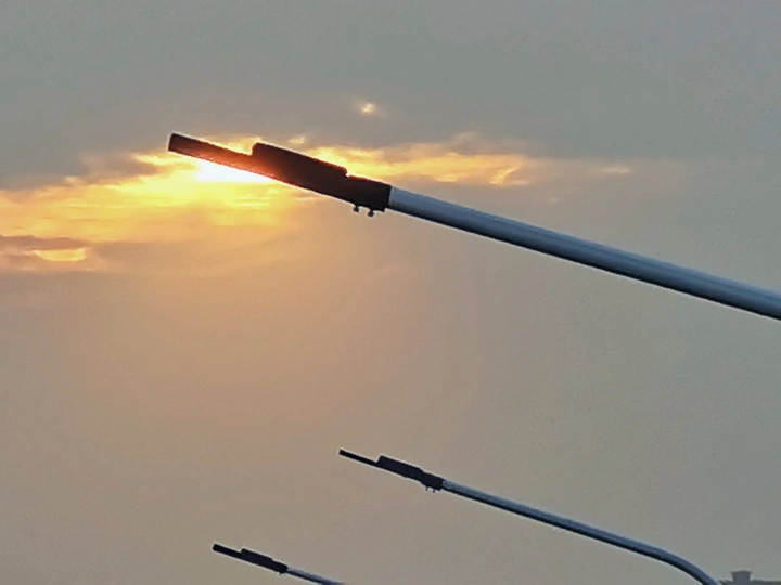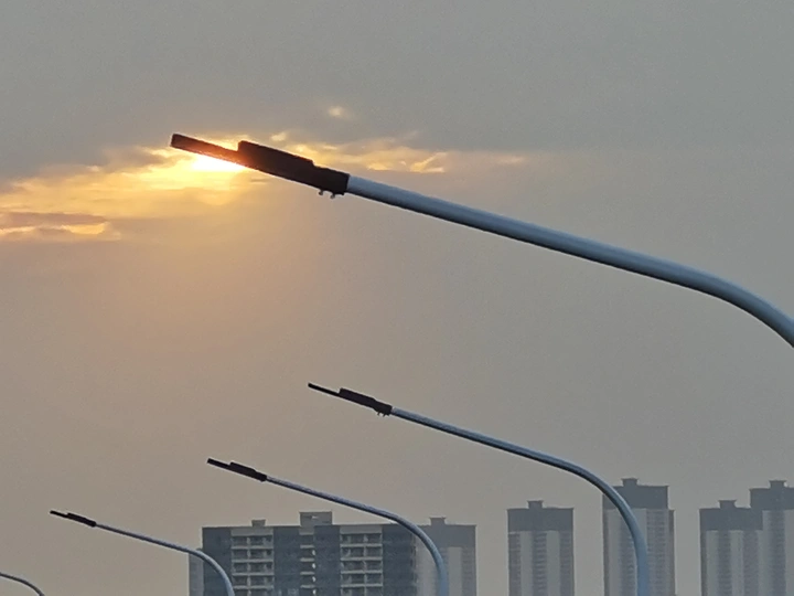 在东莞市梨川桥附近,夕阳西下的时候刚好与路旁的路灯拼合,好似灯光一样照亮着大地。