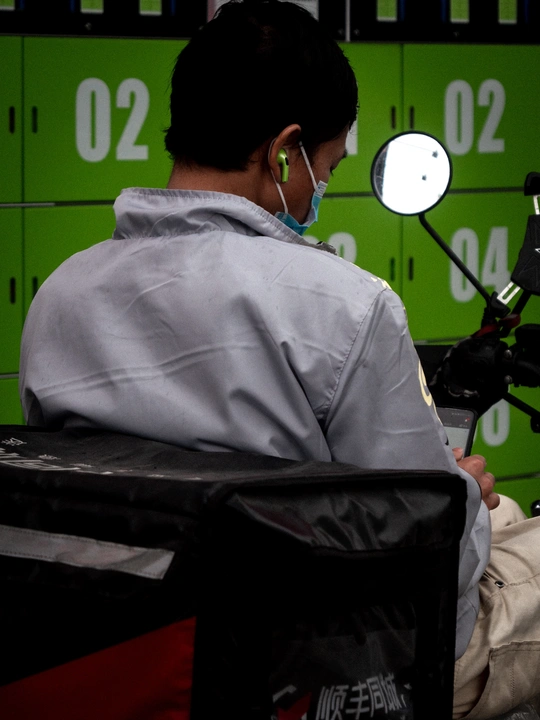 奔波过后的快递小哥停在路旁,将车尾装快递的箱子当背靠,带上蓝牙耳机,身体得到片刻的放松;比较巧妙的是,小哥带着少见的荧光绿蓝牙耳机,与路旁铁柜颜色完全一致!