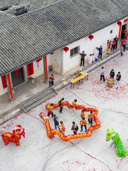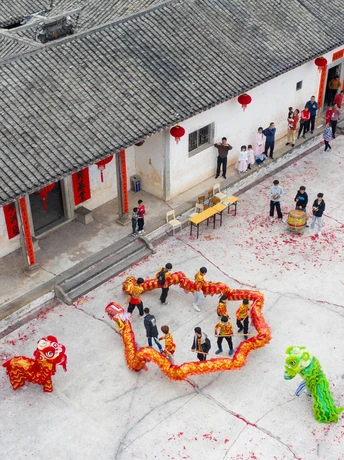客家围屋下的春节,大家都出来看舞龙舞狮表演