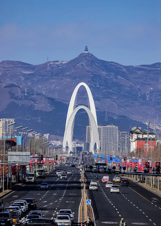 古今同框之新首钢大桥和定都阁: 新首钢大桥 → 北京的新晋网红打卡地,落日余晖下的首钢大桥非常美,随着冬奥会的举办,于2019年九月底建成通车,连接了西长安街沿线的石景山区和门头沟区。 定都阁 → 定都阁位于潭柘寺镇定都峰上,共有6层,外观看为3层,为古色古香的中式建筑造型。定都峰,海拔680米,位于门头沟区桑峪村东北狮山山顶,其位置正处在长安街向西的延长线上,是传说中“燕王喜登定都峰,刘伯温一夜建北京”的所在地,素有“不到定都峰,枉到北京城”和“京西观景第一峰”的美称。 PS:新首钢大桥与定都阁同框,拍摄于古城地铁站出来的过街天桥上,位置很容易找,不过需要用200mm以上的焦段来拍更震撼些。此外,也可以桥上打卡,不过一定注意安全。[嘻嘻][嘻嘻][嘻嘻]