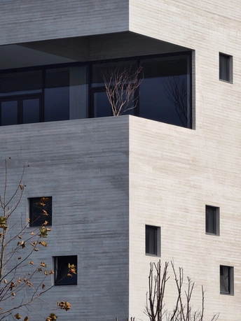 一株小树从一栋混凝土建筑中探出脑袋,无生命的建筑被有生命的小树点缀