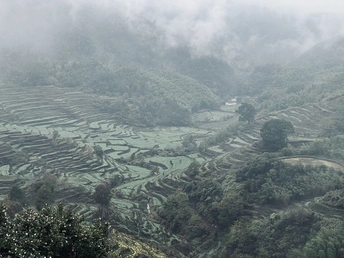婺源篁岭景区,梯田与云雾交织在一起,远处的白墙黑瓦若隐若现~