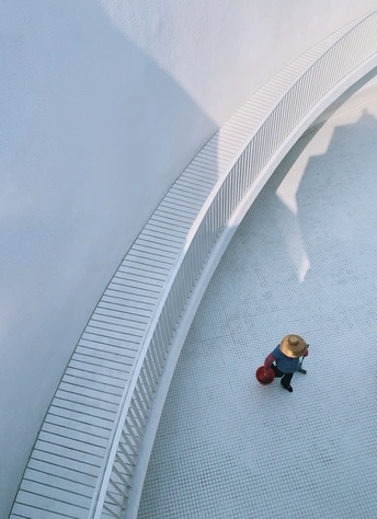 一条缓缓上升到坡道连接起上下两个空间,坡道之下,一位保洁阿姨开始了一天的工作
