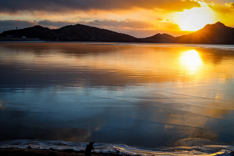 周六我骑自行车来到水库,看到漫天云彩,我决定等一等日落。结果出乎我的意料,真的是非常的美!映入眼帘的是一条冰河,落日的余光,打在冰面上显得格外的好看。眼下一位摄影者正在记录这难忘时刻。而我也被这祖国的大好河山所震憾![嘻嘻]