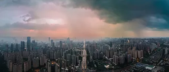 傍晚时分,成都的上空下起区域性降雨,形成的这多彩的一幕。