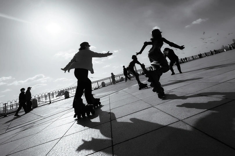 广场上轮滑铜像比着向前冲的姿势,一对中年夫妻开始了模仿秀,老婆向前冲,老公在抓拍,很温馨的画面。 冲,是一种态度