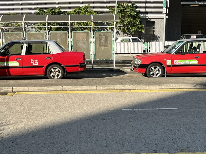 空的红色的士,两辆,一前一后,停在那。阳光泻下来倾斜着照过来留下三角的阴影。一侧是金色的,一侧是灰色的。 这时候,的士的红格外耀眼。 好累好累,我在等待属于我的绿色巴士。