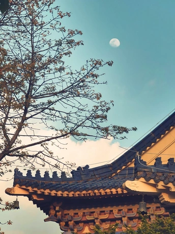 广州中山纪念堂夕阳西下,泛染一檐暖意,木棉树还未开花,而一轮满月已迫不及待地升起。