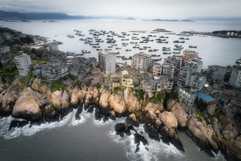 夜幕降临前的奇达村北茭村的航拍,远方的海面上漂浮着船只,近前的海浪拍打着礁石,整个渔村建设在这一孤零零的岛屿上,临海的房屋常年经历着海浪的拍打,居中的一幢建筑是在梦想改造家中的成功案例—船长之家。建筑由国内著名的建筑大师董功老师设计建造,整个建筑于村落“既融入又跳出”:拱自身具备谦卑、内敛的形态不给人以过分侵略或支配的感觉,其曲线形态又区别船长之家于周边任何一个建筑。