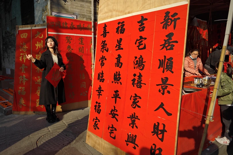 一板之隔两种生活,一边是逛街拍照打卡,另一边是开档做生意,各自有着不同的精彩人生