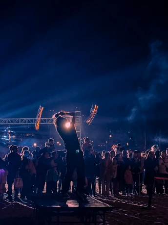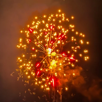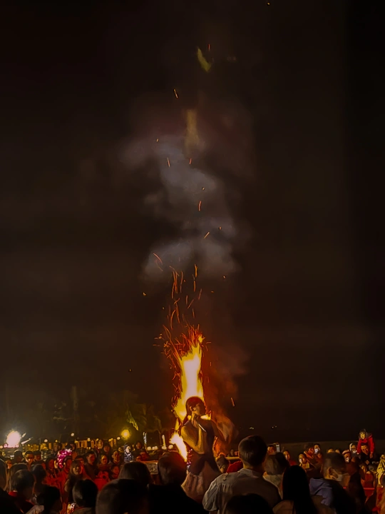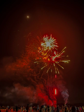 2023年春节期间,广东茂名浪漫海岸,一年一度的篝火晚会,及烟火表演,如约而至。 人们在沙滩上,看完“异国风情歌舞表演”之后,聚集在海边,欣赏美妙的烟花表演,烟火照亮整个海滩,温暖了整个春节。人们围着篝火,尽情欢乐!祈愿来年生活红红火火,平安喜乐。烟火灿烂,聚拢来是烟火,摊开来是人间。 影像整体以红橙色和蓝色为主,冷暖色调的对比,表现人间烟火气息,从远处看,刚好有一轮月亮挂在火焰的上空,很有诗意。也许生活就是一半烟火,一半诗意。 烟火向星辰,所愿皆成真。