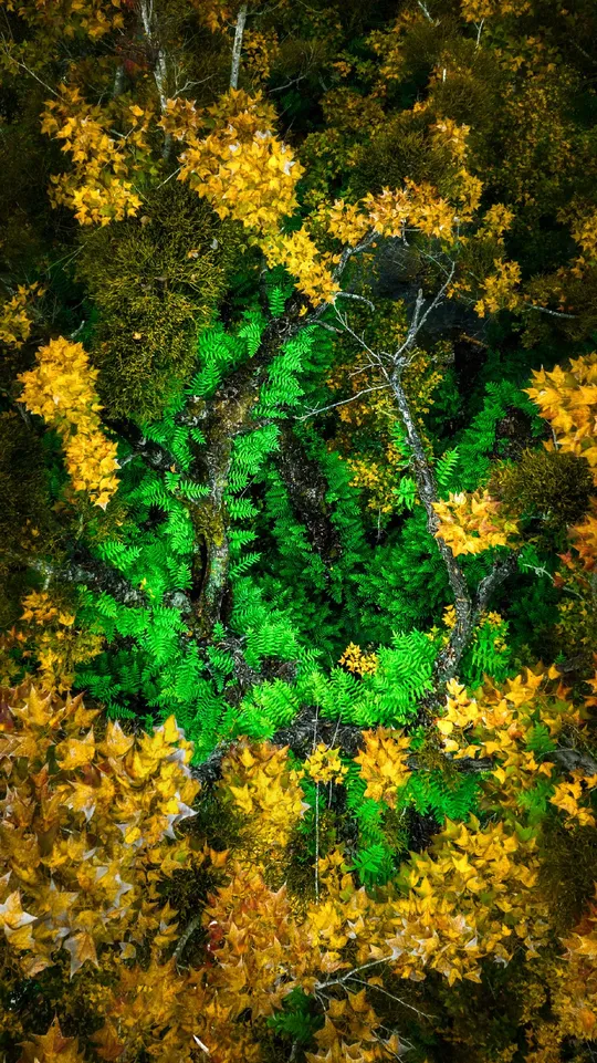 冬季,在福建安溪的深山里,我发现了这颗古老的千年枫树,当我把无人机飞到树顶的时候,被呈现在遥控器屏幕里的色彩美呆了,古枫树树干上寄生的茂盛绿色苔藓已经和枫树融为一体,苔藓的绿色与枫树叶的黄色形成了视觉冲击力超强的相生色彩!