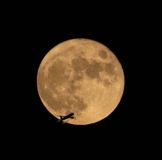 2021年中秋,拍摄于杭州钱塘江岸边,当时一直跑动+等待很久,终于拍到了两组飞机凌月,这是其一