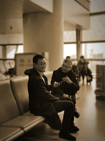 西安咸阳国际机场看到两人在聊天,也许是在聊他们年轻时的故事。当我拍照的瞬间,左边大哥转过脸来,记录下了这一刻!
