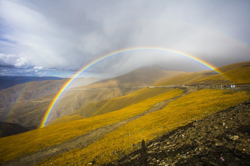 在去往羊卓雍措的山路,一路下起了小雨,上山途中,雨势渐大,心中念叨,若此时见彩虹,必为盛景。下车回头远望,赫然见双彩虹悬于半空,俯接天地,叱咤云层,狂奔拍照,以留纪念。