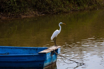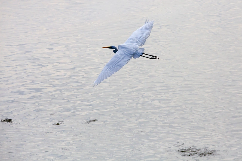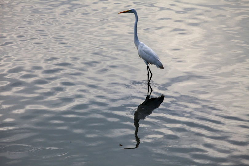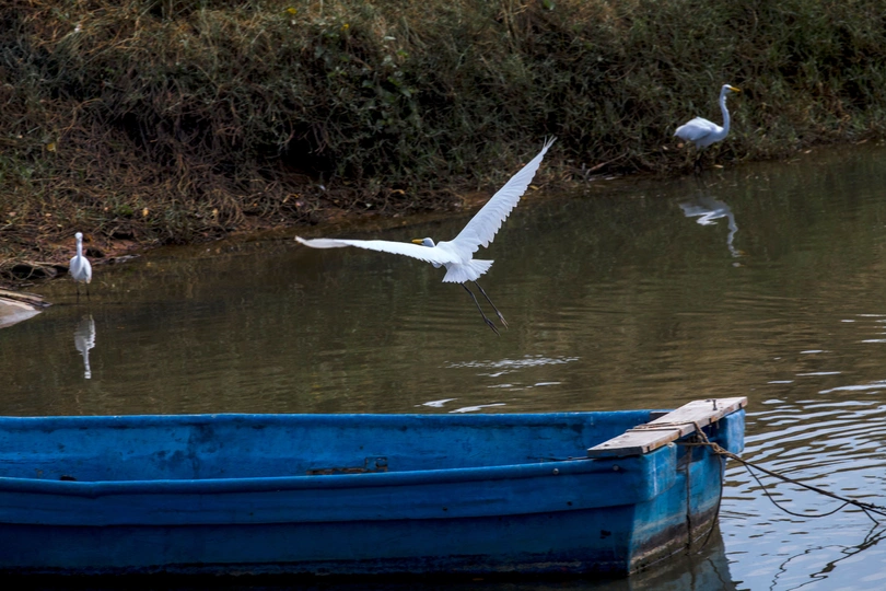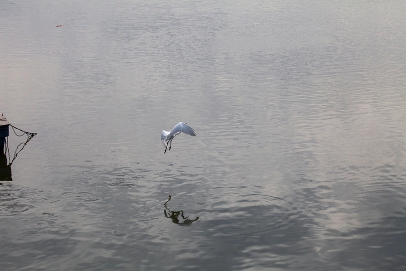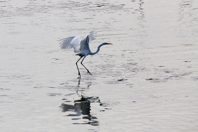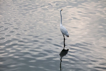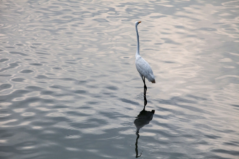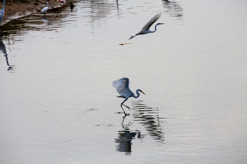 海南岛崖州湾渔港,一群白鹭在海边追逐嬉戏,上演着一岀水上芭蕾。