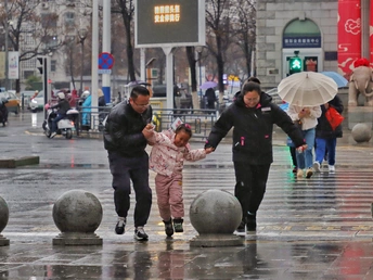 街头阵雨来袭,一对夫妻拎起小孩就跑,准备到商场里面躲雨。