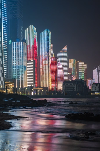 青岛夜晚的CBD,从第三海水浴场利用长焦进行拍摄,LED灯与大海结合,十分壮观。凸显出新时代的经济发展成果与城市发展成果!!!