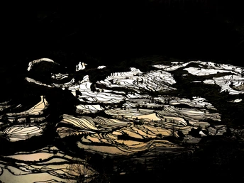在傍晚时分,梯田里的水光的在反射下波光粼粼,像一幅油画一样。