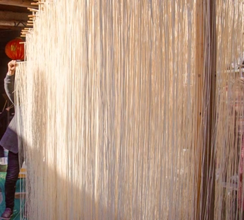 这种传统的做面方法在以前的江南农村很常见到的。将面团和好并醒发好后,搓成一根大拇指粗细的条,再将面条绕在两根相距10几厘米的小竹棍上,等到面条差不多绕满竹棍时,将固定着小竹棍***往两边不停的撑大到一定长度再挂在木架子上晾晒。此面通常都在干燥的晚秋和冬季做,因为此面有一定咸度,容易吸潮发霉。小时候吃着这面就知道离过年会越来越近,越来越近,喜悦之情油然而生,直至将年送走。此图就是晾晒着的垂面。