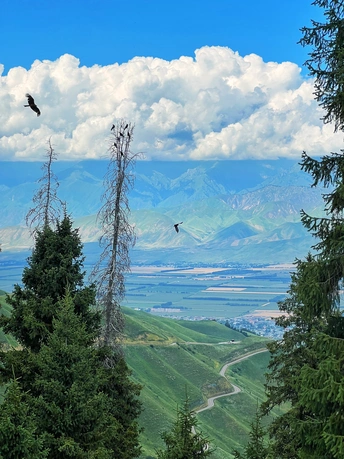 登顶那拉提草原,在一片树林里,看到一棵没有光秃秃的大树上歇息着老鹰和乌鸦。我等了一会儿,两只老鹰终于展翅盘旋。