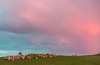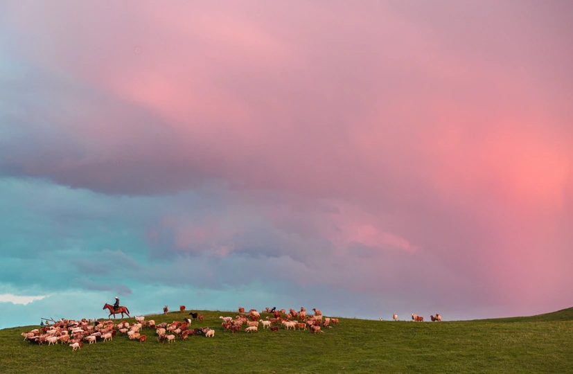 夏塔草原上,傍晚的火烧云染红了半边天,牧羊人骑着马带着他的羊群伴着夕阳余晖行向远方的家