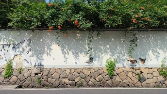 墙上的彩绘与爬上墙头的凌霄花组成了一幅背景画