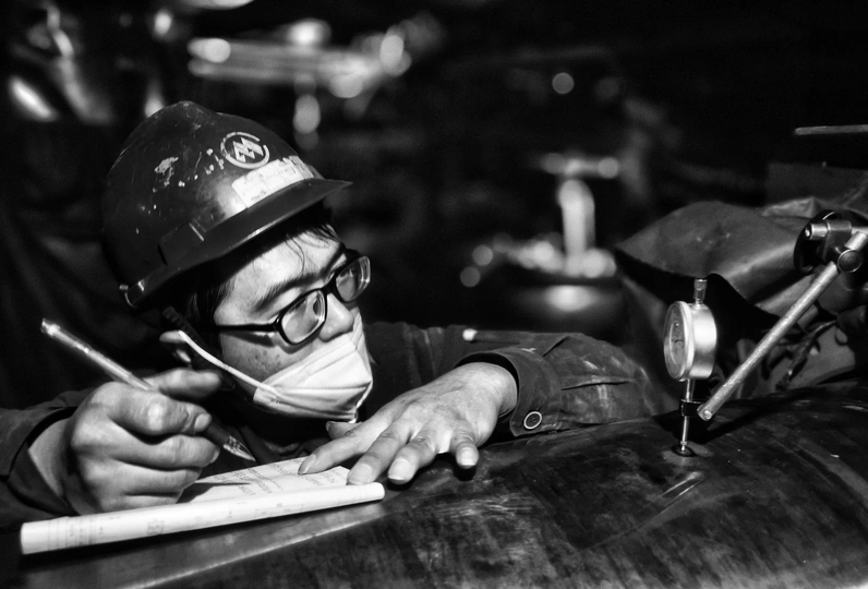 工地现场抓拍一位技术工人聚精会神查看仪表,记录。点赞一线工人。
