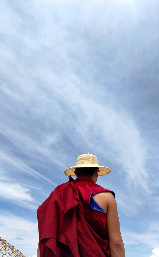 青海青海湖边,2021年7月3日,一位藏民,征得人家的同意,我在他的背后蹲下身子,以仰拍的角度,把他的背影映在了蓝天白云下。 拍摄:三石 小米K30 青海湖边 2021年7月3日