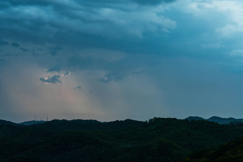 日落时间夕阳撒在雨帆上,偶尔出现闪电,可惜距离比较远,闪电看起来非常的纤细