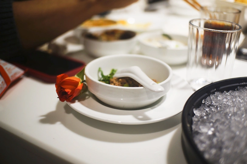 索尼NEX5T+铭匠50mm f2 师兄请我们在海底捞吃饭,我用牛肚上面装饰用的小花放在盘子上