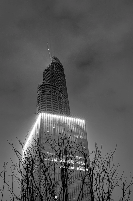 未完工的大厦,向上生长的树枝,在竖直方向重合,像是顽强的生命力,在野蛮生长。