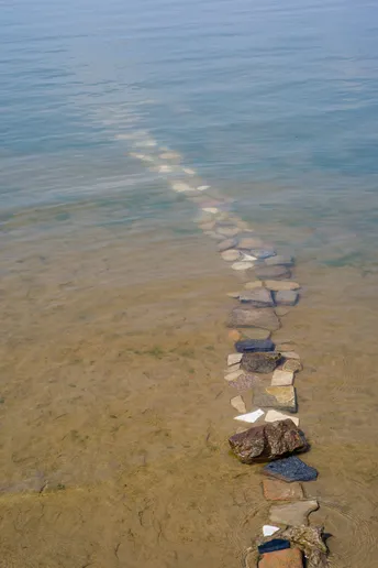 估计是冬天江水浅的时候,有心人用碎石块铺就的一条垫脚石路,弯弯的从岸边到江心,现在春天了,水势上涨,淹没了石块,但依然清晰可辨,也许那时候是一对父子来到江边玩耍,又或者是一对可爱的恋人,到底是谁铺就的呢?也许只有这一排碎石块知道,这里曾经发生的欢笑和美好,时光匆匆,逝去的只是时光,那一段美好的回忆一定已经被人珍藏!