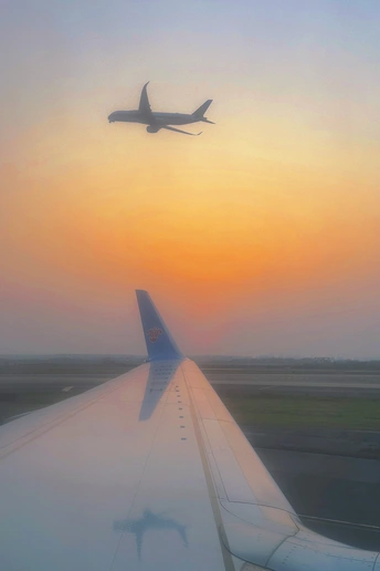 我乘坐的飞机,在傍晚,落地广州新白云机场。 舷窗外,余晖下,另一架飞机相向而飞,擦肩而过。