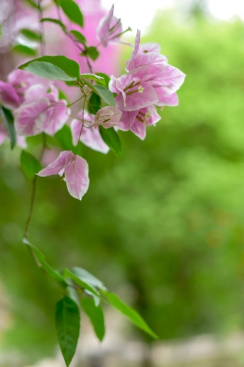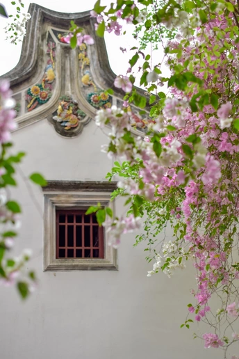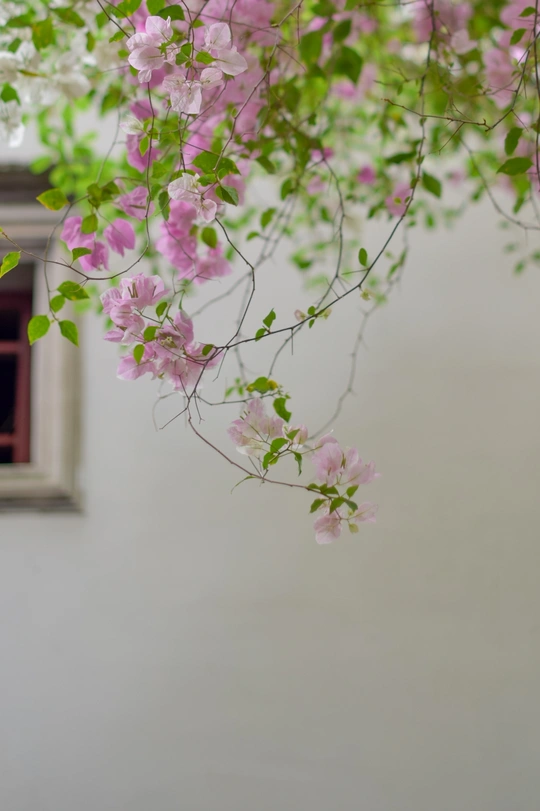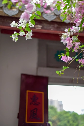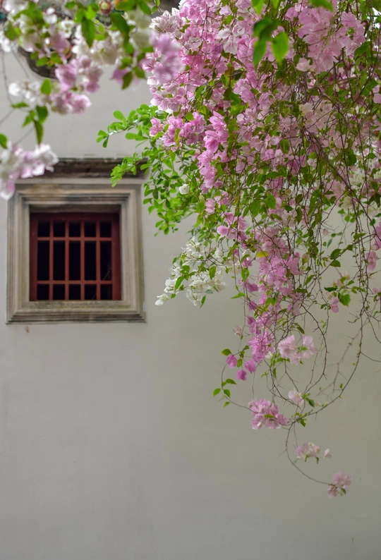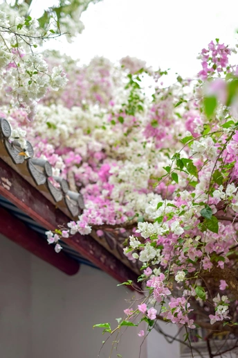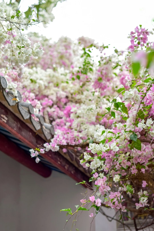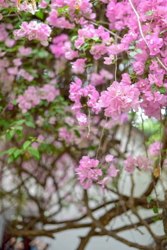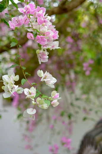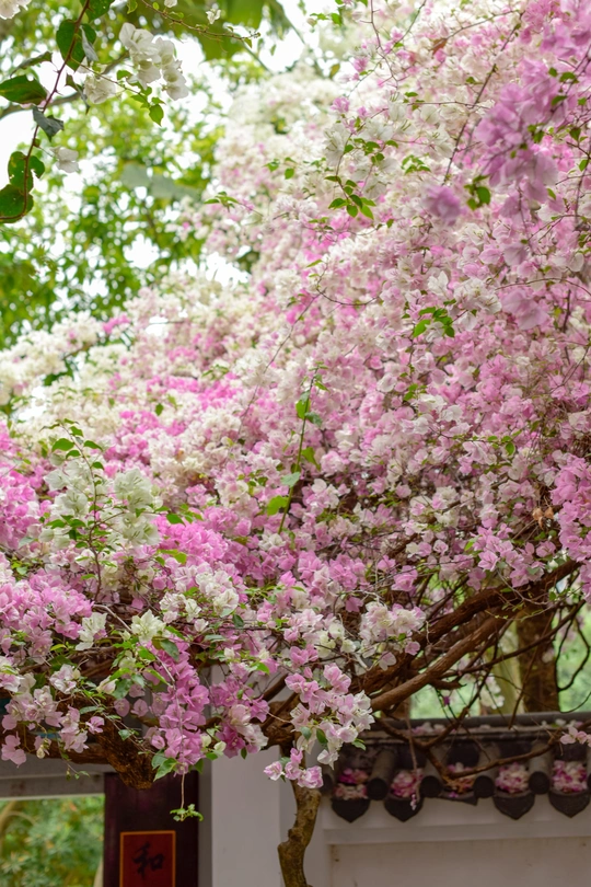 簕杜鹃花(三角梅),是深圳市市花。 图片中的簕杜鹃树,位于深圳市园博园内的一棵老簕杜鹃树,在春天里同时盛开红、粉、白、紫和红白相间的花瓣,树干向天空延伸,藤蔓往四周散发,像倾泻而下的花海瀑布,尽显灿烂芳华。色彩缤纷,惊艳鹏城。