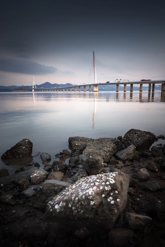 平静的海面倒映着连通深圳与香港的深圳湾大桥