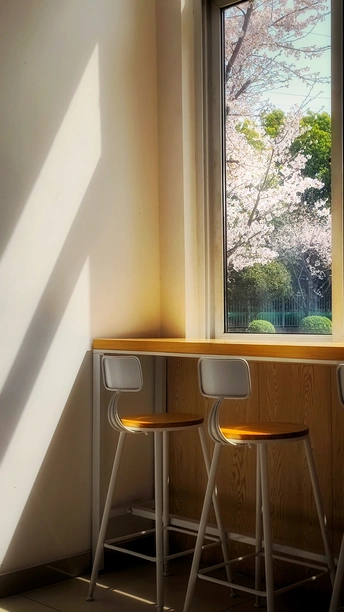 公司樱花盛开,小卖部处透过玻璃赏花