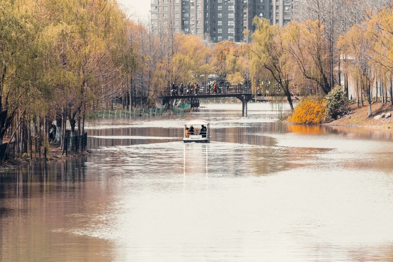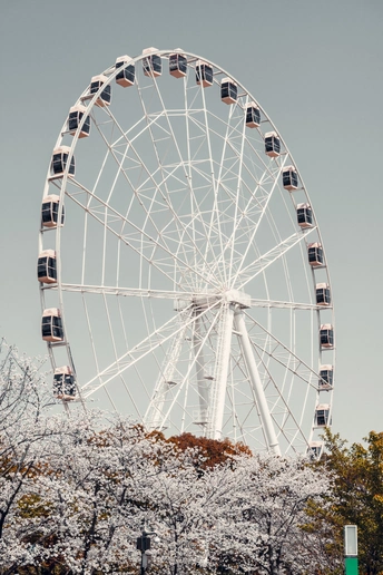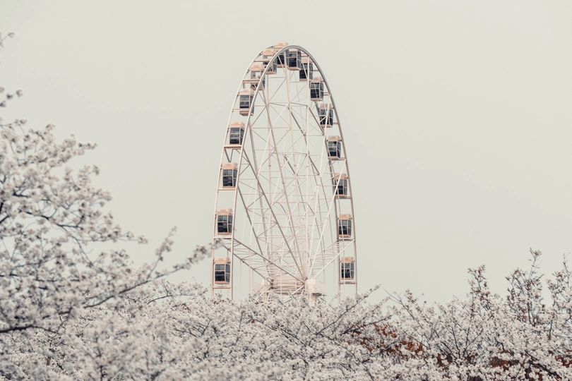 夕阳笼罩着樱花树,湖泊上漂流着游人坐着的小船,绿荫笼罩着铁轨,摩天轮下面千千万万的樱花树,樱花围绕动漫可爱妹子手办,顾村公园上方许许多多飞行许久的无人机~
